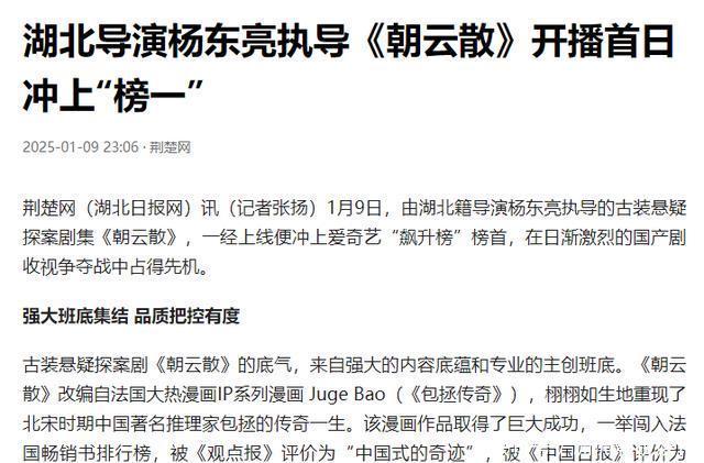 而随着剧情推进,尉迟华(阚清子饰)和新官上任三把火的王昆吾(杜淳饰)也悉数登场,他们或在城内处理小偷小摸,或在酒楼巧设陷阱对付胡人,一边解谜,一边制造笑点,尽管案件层层推进,但丝毫不显压抑,剧情轻快又紧凑。 无论是《朝云散》的中式邪典悬疑,还是《四方馆》的轻喜剧探案,这两部剧都为观众提供了不同类型的观剧体验。 前者通过压抑与恐怖营造氛围,深入剖析人性复杂;后者则在轻松氛围中传递悬疑推理的乐趣,它们不仅让我们看到国产古装探案剧的丰富可能性,也让人期待未来更多这样的高质量作品, 随着观众对悬疑探案题材的兴趣日益高涨,中式探案剧正在迎来属于自己的春天。 参考来源: 荆楚网湖北导演杨东亮执导《朝云散》开播首日冲上“榜一”